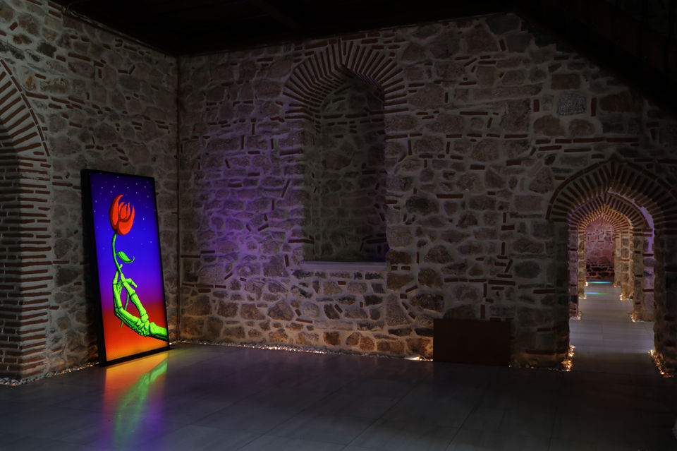 A continuation of the Forever Sultan Universe, I think the Sultan knows about us expands on the video game aesthetics Sarp Kerem Yavuz initially adopted when designing his neon sculptures of undead Ottoman courtesans. The pixel art portraits of the various inhabitants that occupy this fictional universe exist as large-scale lightboxes, illuminating their environment like the desktop computer monitors of the 90s, in the dead of night. The title is a nod to the artist's Istanbul gallery being raided by the Turkish Ministry of Culture on account of artworks that "offend the legacy of the Ottoman Empire."